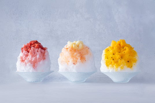 左から、あまおうミルク氷、丸ごともも氷、マンゴーパッション氷