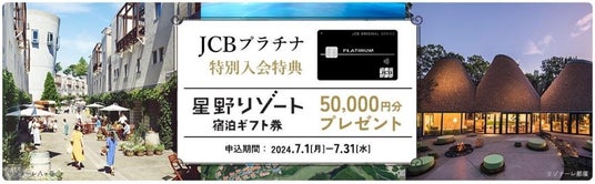 株式会社ジェーシービー (本社:東京都港区、代表取締役兼執行役員社長:二重 孝好、以下:JCB)は、2024年7月1日(月)から7月31日(水)の期間中、JCBプラチナへ新規入会されたお客様を対象に、「星野リゾート宿泊ギフト券5万円分プレゼントキャンペーン」を実施します。