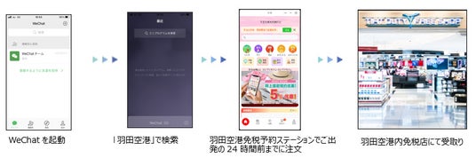 WeChatをインストールし、アプリを立ち上げて画面右上の「+」ボタン→「スキャン」より、読み取りコードをスキャンして免税事前予約アプリにアクセスし、商品を事前に予約。出国時に羽田空港免税店で受取り。