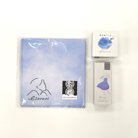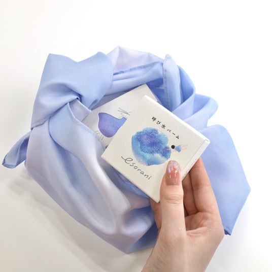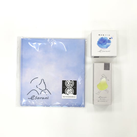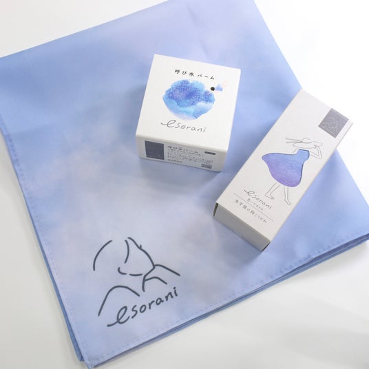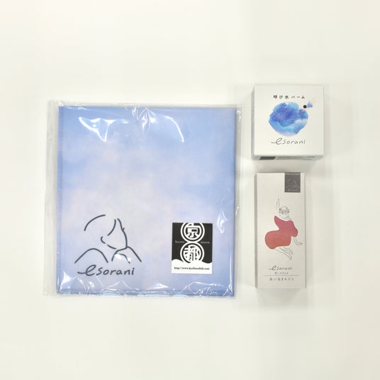 期間中、特設コーナーでは「サナ エソラニ 呼び水バーム」・「サナ エソラニ 思いでオイル」にesoraniオリジナルイラストの風呂敷『エソラ風呂敷』がセットになった数量限定オリジナルセットを販売いたします。(思い出オイルは01~03のいずれか)