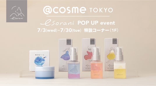『esorani』は、日本の四季や景色・伝統などから新しい着想を得ながら、“心と肌に心地よい”をテーマに作られたコスメブランドです。通常はオンラインでしか買えない「esorani」のフルラインアップを、たくさんの方にお試しいただきたく、@cosme TOKYO 1階に特設コーナーを設置いたします。この機会にぜひ、香りや質感、肌触りやパッケージなどのこだわりが詰まった商品をご体感ください。