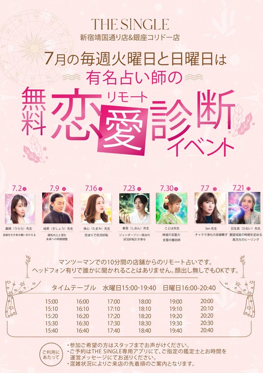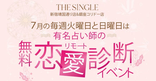 and factory株式会社(本社:東京都目黒区、代表取締役社長:青木倫治、以下and factory)が運営する電話占いサービス「電話占いウララカ」は、株式会社セクションエイト(本社:東京都渋谷区、代表取締役社長:安田 隆之、以下セクションエイト)が運営する1対1の相席専門店「THE SINGLE」とコラボレーションしたスペシャル企画を、好評につき7月は実施店舗を拡大して開催いたします。経験豊富な占い師とマンツーマンで繋ぐリモート恋愛診断イベントを開催。