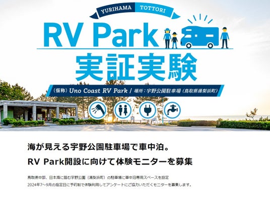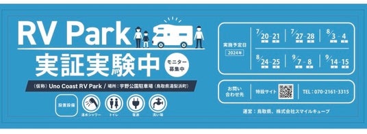 鳥取県でアウトドア事業(TOTTORI-CAMPPARK)を展開する株式会社スマイルキューブ(本社/鳥取県南部町)は、県中部の日本海沿いにある宇野公園(湯梨浜町宇野地区)の駐車場にてRV Park開設をめざす実証実験を開始します。7月20日~9月15日までの週末土日のうち6回、公園駐車場内に専用スペースを確保して必要な設備とともに車内泊ユーザーに提供。1泊2日のモニター利用者を募集します。