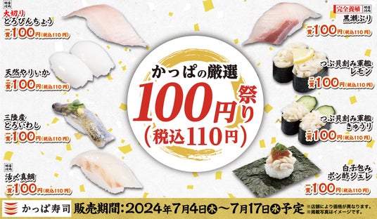 かっぱ寿司では、うまい寿司を手頃な価格で思う存分楽しんでいただきたいという思いで、一皿100円(税込110円)という価格と品質にこだわり、商品提供をしています。さらに、その時々の厳選ネタを一皿100円(税込110円)で提供する『厳選100円(税込110円)祭り』を定期的に開催しております。