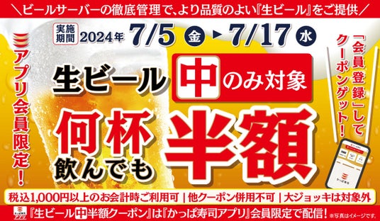 コロワイドグループのかっぱ寿司(カッパ・クリエイト(株) 本社:神奈川県横浜市、代表取締役社長:山角豪)は、2024年7月5日(金)~7月17日(水)の期間、かっぱ寿司で利用できる「生ビール(中)半額クーポン」をかっぱ寿司アプリ会員に配信いたします。