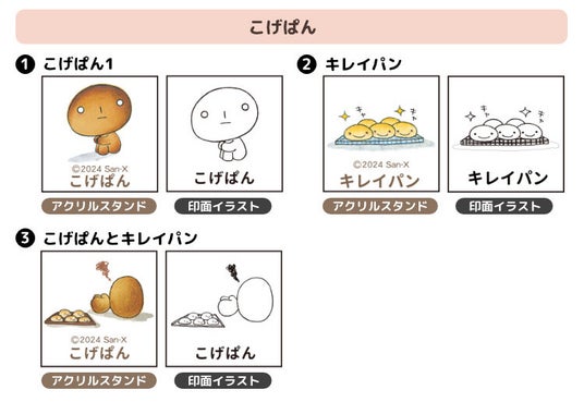 「San-X レジェンドキャラクター はんこコレクション」は、平成に一世を風靡した、懐かしくてかわいいSan-X (サンエックス)のレジェンドキャラクター「たれぱんだ」「こげぱん」「アフロ犬」「モノクロブー」のキャラクターのアクリルスタンド(アクスタ)に同柄のスタンプが合体したホビー感覚で楽しめるハンコ。