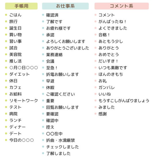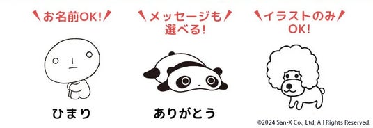 スタンプはイラストのみか、文字ありから選ぶことができます。文字ありの場合は、自分やお子さまの名前を入れてネームスタンプとして使ったり、たくさんのメッセージから好きなものを選んでメッセージスタンプにすることができます。