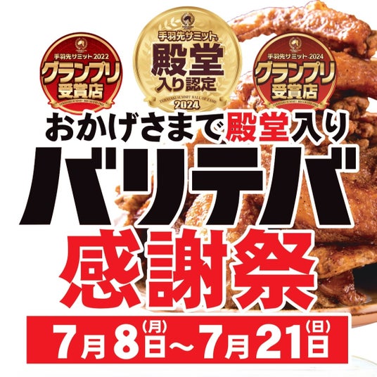 株式会社ヴィア・ホールディングスの子会社である株式会社扇屋東日本、西日本(東京都新宿区、代表:楠元健一郎)が運営する、「やきとりの扇屋」「備長扇屋」「炭火焼鳥オオギヤ」の名物メニュー「バリテバ」が、ありがとう10周年!手羽先サミット(R)において、多数の強豪が集まるなか、最高賞のグランプリを受賞しました。その受賞を記念して、感謝祭を実施します。