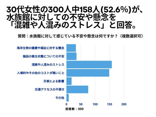 30代女性の300人を対象とした「水族館に対して感じている不安や懸念は何ですか?」というアンケートで158人(52.6%)が「混雑や人混みのストレス」という結果になりました。