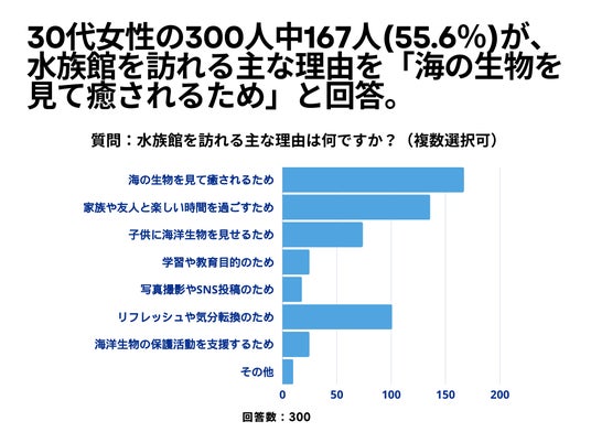 30代女性の300人を対象とした「水族館を訪れる主な理由は何ですか?」というアンケートで167人(55.6%)が「海の生物を見て癒されるため」という結果になりました。