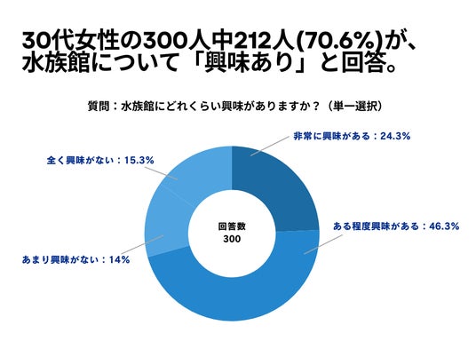 30代女性の300人を対象とした「水族館にどれくらい興味がありますか?」というアンケートで212人(70.6%)が「水族館について興味あり」という結果になりました。