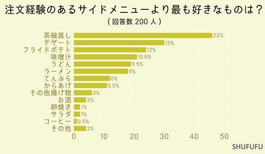 注文経験のあるサイドメニューより最も好きなものに関しては1位「茶碗蒸し(23%)」、2位「デザート(15%)」でした。お寿司の付け合わせとしてメジャーな茶碗蒸しは、回転寿司屋さんでも人気のようです。