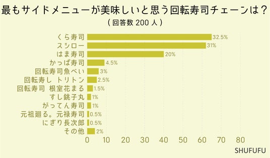 最もサイドメニューが美味しいと思う回転寿司チェーンを尋ねたところ、1位は「くら寿司(32.5%)」、2位「スシロー(31%)」となりました。くら寿司とスシローが僅差になる結果でした。チェーン店の規模としてはスシローの方が上ですが、サイドメニューの評価に関してはくら寿司の勝利となりましたね。