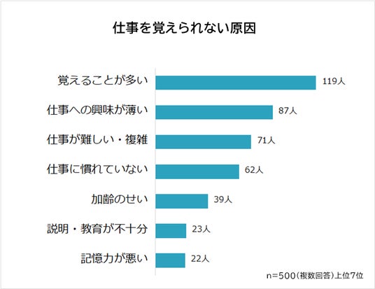 回答内容は大きく分けて「仕事の環境」と「個人的な事情」の2パターンになりました。記憶力が低下しているなどの個人的な事情だけではなく、「どんな仕事をしているのか」「効率的に仕事を覚えられる環境なのか」なども重要だとわかります。