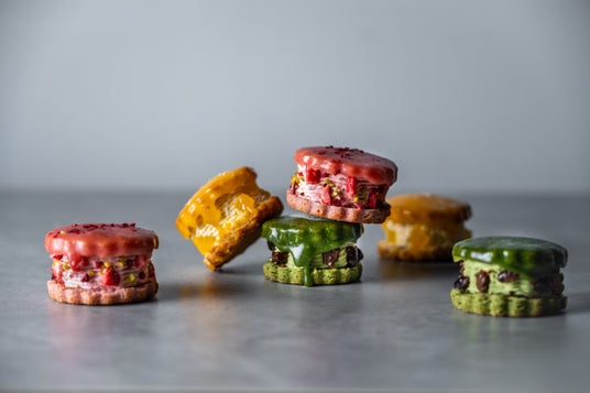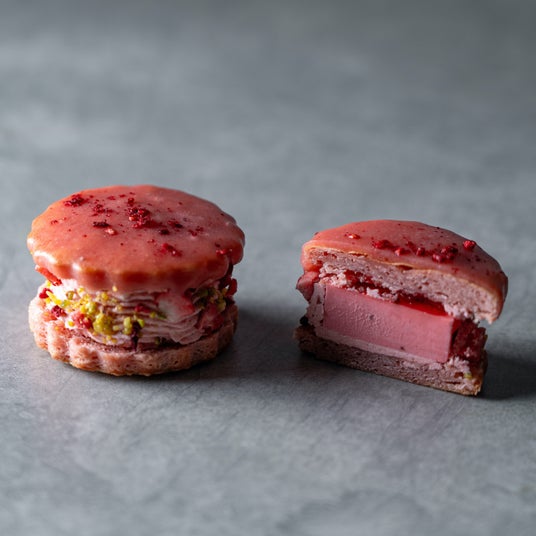 ストロベリーサンドスコーンストロベリーのスコーン生地に、ストロベリームースと濃厚なストロベリークリーム、甘酸っぱい味わいにバジルのアクセントが香る、ストロベリーバジルコンフィをサンドしています。ピスタチオと真っ赤なラズベリーで鮮やかに彩りました。