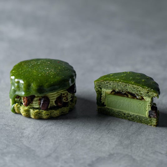 宇治抹茶&黒糖サンドスコーン宇治抹茶の緑鮮やかなスコーン生地に、香り豊かな宇治抹茶のムースと宇治抹茶クリーム、濃く深い味わいを引き立てる黒糖ジュレをサンドしています。香ばしい黒糖ロッシェと小豆でトッピングし、宇治抹茶のグラサージュに金粉を添えて和の風合いに仕上げました。
