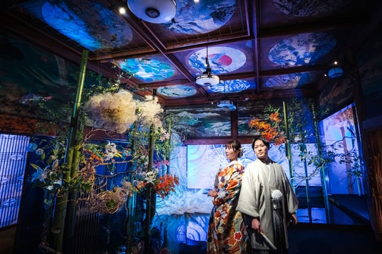 物語を創り上げるのは40名を超えるつくり手たち。軽やかに天井を泳ぐ切り絵加工の鯉、いけ花でダイナミックに表現された水流、その流れに逆らい力強くもしなやかに舞う水墨画の龍など、文化財を舞台に、異なる技術と感性のコラボレーションにより生まれた、ここでしか出合うことのできない空間展示をお愉しみください。