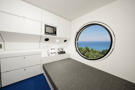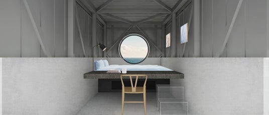 水平線に寄り添うように空間を二分し、上部空間はカプセルの構造躯体をアートと見立てたギャラリー空間、下部空間は宿泊設備を備える。メタボリズムの思想の下、都市(銀座)から自然(水平線)へと交換された風景をカプセル内部に取り込むことで新陳代謝する。