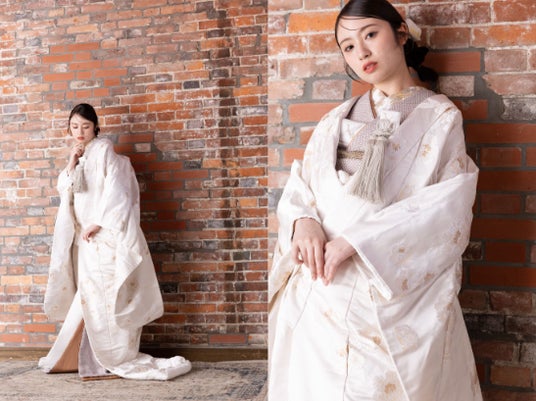 和装で人気の白無垢にブロンズの刺繍が美しい白無垢と桃色の桃無垢を採用