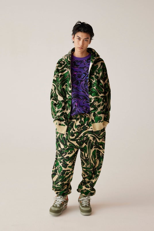 ストリートウェアのルーツでもあるヒップホップ、パーティーカルチャー、そして新しいポップカルチャーにトレンドを加えています。今シーズンのハイライト柄のひとつであるマーブリングカモは、BAPE(R)のシグネチャーであるABC CAMOから派生したもので、マーブリングというペインティング方法を用いて、色鮮やかに仕上げています。