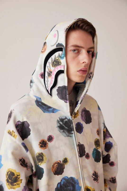 日本の伝統的な刺青技法「和彫り」からもインスピレーションを得て、狛犬と牡丹、花のグラフィックをクラシックな“シャークフーディー”に描きました。