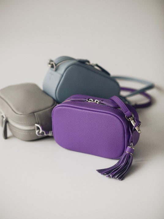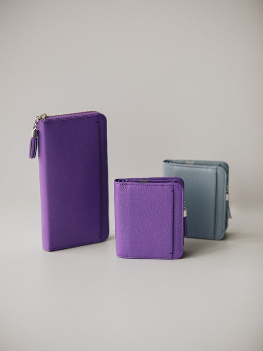 2つの限定色「パープル」「ブルーイッシュグレー」が登場。はっと目を引くパープル肌なじみが良く、見た目以上にさらりと持てる色です。内装の生地と付属革は共にあたたかみのあるグレー色を採用し、全体的にシックで落ち着いた印象に。ステッチは外装革のパープル色になじむ同色を使用しました。
