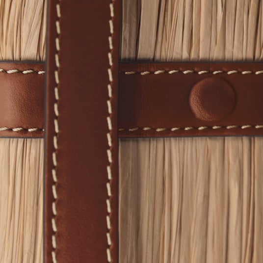 第1弾となるこのモデルは、天然ラフィアを使用し、わらの束をそのままバッグにしたかのような幻想的なデザイン。野原の麦わらから直接インスピレーションを得ています。100%天然のオーガニック認証を受けたラフィア素材をコニャックのレザーストラップ2本で束ねたものに、ダブルのショルダーストラップが付いた姿は、麦わらの束そのもののような錯覚を起こさせます。
