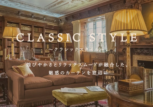 インテリアの王道ともいえるクラシックインテリアを暮らしの中で楽しむ “クラシックカーテン特集”が新たにスタートしました。日常に品格をもたらし、華やかでリラックスした雰囲気が漂う空間を演出する、”クラシック”をテーマにしたインテリア特集です。クラシックインテリア特集では、ヨーロッパで活躍するデザイナーが手がけたアートワークから、色彩美あふれるパターンまで、さまざまなクラシックインテリアを提案します。今までにないクラシカルなインテリアは、お部屋を魅惑的な空間へと導きます。