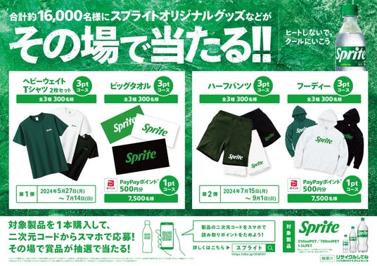 応募方法:期間中に対象製品を購入してラベルに記載の二次元コードをスマートフォンで読み込み、キャンペーンサイトにアクセスすると、ポイントが貯まります。キャンペーンサイトから貯めたポイントで応募すると抽選で1,200名様に「スプライトオリジナルグッズ」または、15,000名様に「PayPay ポイント 500円分」がその場で当たります。