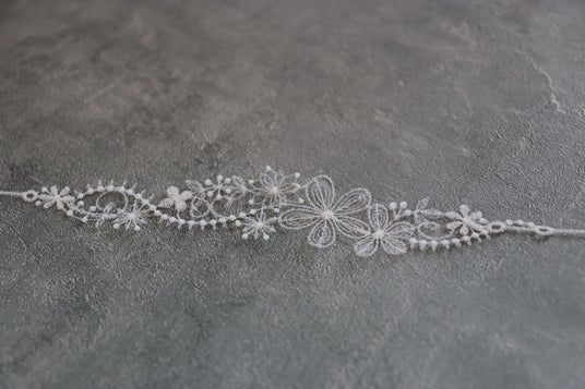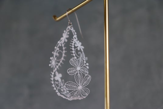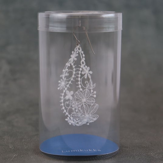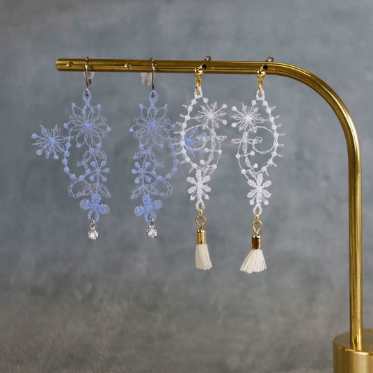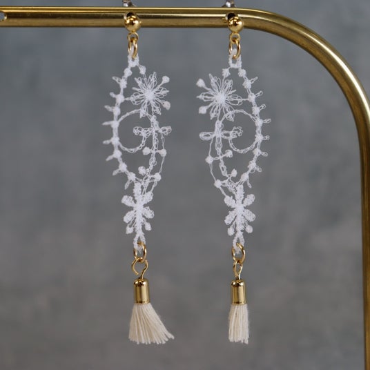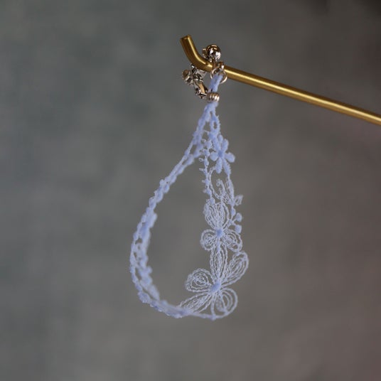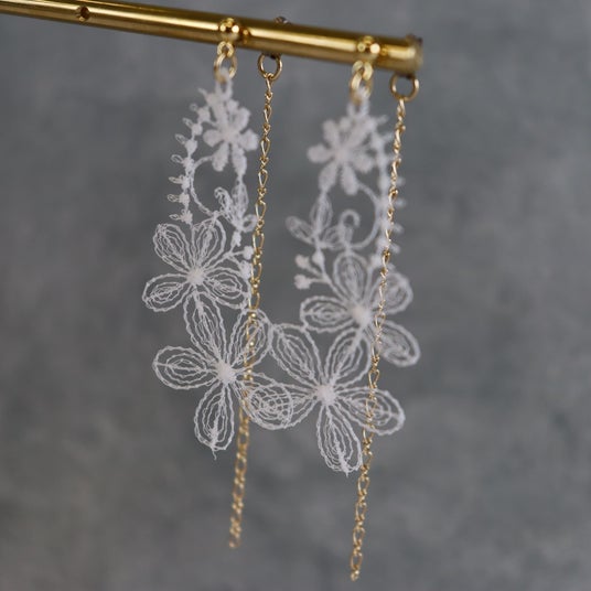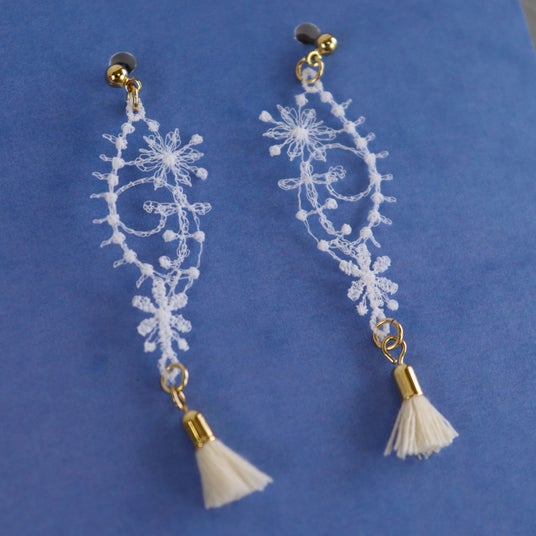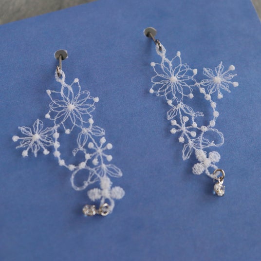 Lumikukkaのアクセサリーは刺しゅう後に生地を溶かし、糸だけが立体的に残るように設計されています。糸の形が崩れないよう一針一針精密に設計して縫うレースアクセサリーは、刺繍レースが持つ技術・芸術の両面を映し出します。