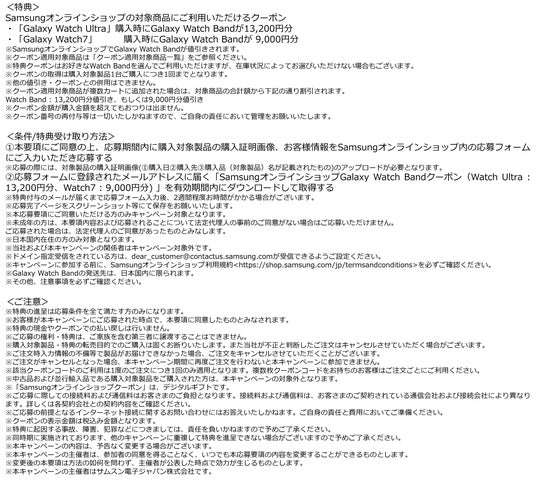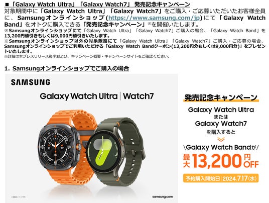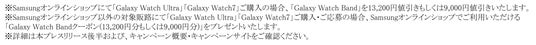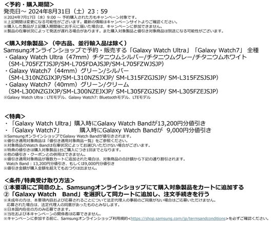 また、対象期間中に「Galaxy Watch Ultra」「Galaxy Watch7」をご購入・ご応募いただいたお客様全員に、Samsungオンラインショップ(https://www.samsung.com/jp) にて「Galaxy Watch Band」をオトクに購入できる「発売記念キャンペーン」※を開催いたします。