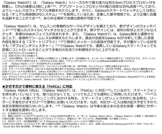 サムスン電子ジャパン株式会社(以下サムスン)は、「FeliCa」に対応し健康的な毎日のモチベーションとパフォーマンスを上げる最新スマートウォッチ「Galaxy Watch Ultra (LTE)」「Galaxy Watch7 (LTE/Bluetooth)」および純正・専用アクセサリーの発売を決定いたしましたのでお知らせいたします。
