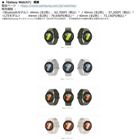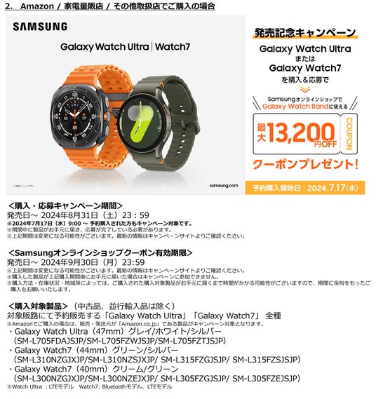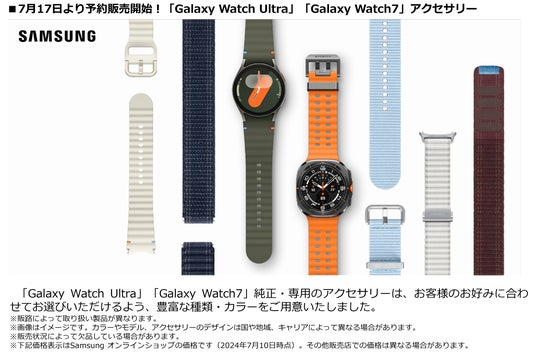 「Galaxy Watch Ultra」「Galaxy Watch7」および純正・専用アクセサリーは、Samsungオンラインショップ(https://www.samsung.com/jp/offer/)、 世界最大級のショーケース「Galaxy Harajuku」(東京・原宿)、「GalaxyStudio Osaka」(大阪・なんば)、「Galaxy Experience Space」(SHIBUYA TSUTAYA 1F)※、主要ECサイト、家電量販店等にて、2024年7月17日(水)より予約受付を開始します。「Galaxy Watch Ultra」は2024年7月下旬以降、「Galaxy Watch7」は7月31日(水)より販売を開始いたします。