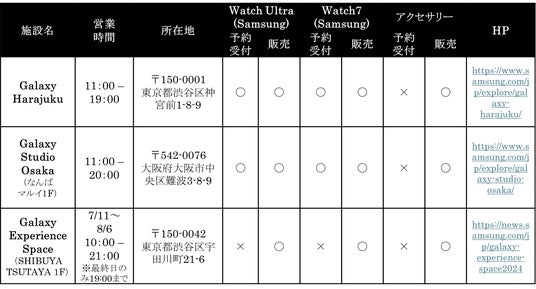 7月11日より、新製品をGalaxy世界最大級のショーケース「Galaxy Harajuku」(東京・原宿)、「Galaxy Studio Osaka」(大阪・難波/なんばマルイ1F)と、今回新設する期間限定の特設会場「Galaxy Experience Space」(東京・渋谷)にて順次展示予定※です。是非この機会にご来店ください。なお、「Galaxy Watch Ultra」「Galaxy Watch7」の純正・専用アクセサリーは下記3つのショーケースすべてでご購入いただけます。是非この機会にご来店ください。