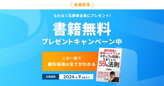 新刊発売を記念して、デンタルHR総研株式会社では無料キャンペーンを実施中です。2024年7月1日から2024年9月30日までの期間限定で、「歯科医院の採用ハンドブック スタッフの採用がうまくいく59の法則」を無料でプレゼントいたします。この機会にぜひご応募ください。