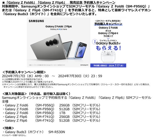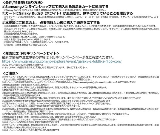 また、2024年7月17日(水)から対象期間中にSamsungオンラインショップにてSIMフリーモデル「Galaxy Z Fold6」「Galaxy Z Flip6」をご購入いただいたお客様に、本日発表の最新ワイヤレスイヤホン「Galaxy Buds3」をプレゼントする「発売記念 予約キャンペーン」※を開催いたします。