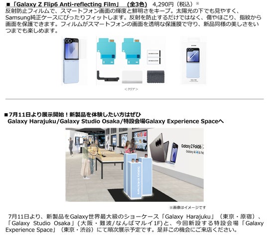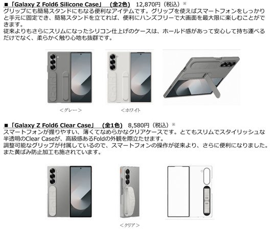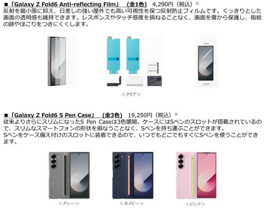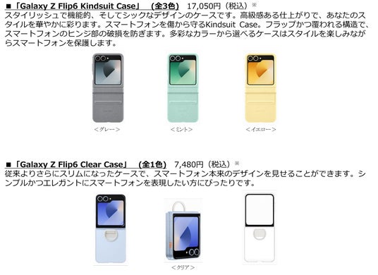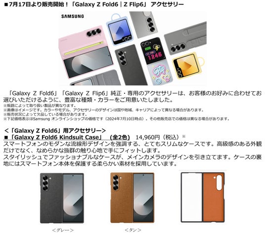 また、「Galaxy Z Fold6」「Galaxy Z Flip6」の純正・専用アクセサリーはSamsungオンラインショップ、「Galaxy Harajuku」、「Galaxy Studio Osaka」、「Galaxy Experience Space」、全国の家電量販店、主要ECサイト等にて、2024年7月17日(水)より販売を開始いたします。