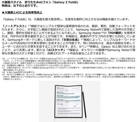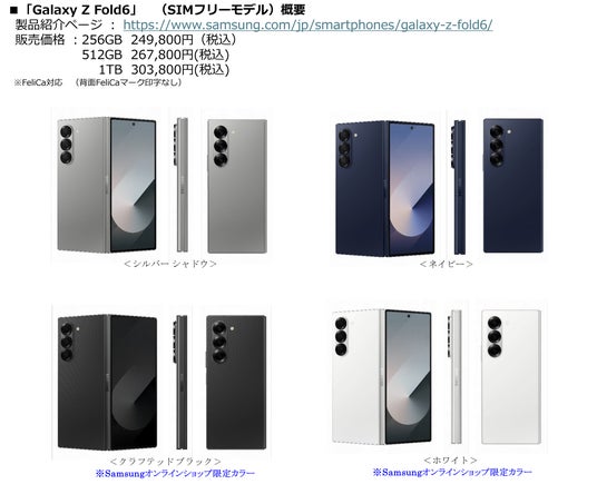 サムスン電子ジャパン株式会社(以下サムスン)は、新次元のGalaxy AIを搭載した初の最新折りたたみAIフォン「Galaxy Z Fold6」「Galaxy Z Flip6」のSIMフリーモデルおよび純正・専用アクセサリーの発売を決定いたしましたのでお知らせいたします。