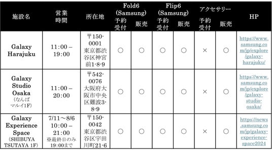 「Galaxy Z Fold6」「Galaxy Z Flip6」(SIMフリーモデル)はSamsungオンラインショップ(https://www.samsung.com/jp/offer/)、世界最大級のショーケース「Galaxy Harajuku」(東京・原宿)、「Galaxy Studio Osaka」(大阪・なんば)、「Galaxy Experience Space」(SHIBUYA TSUTAYA 1F)※1、2024年7月17日(水)より予約受付を開始し、7月31日より販売を開始いたします。