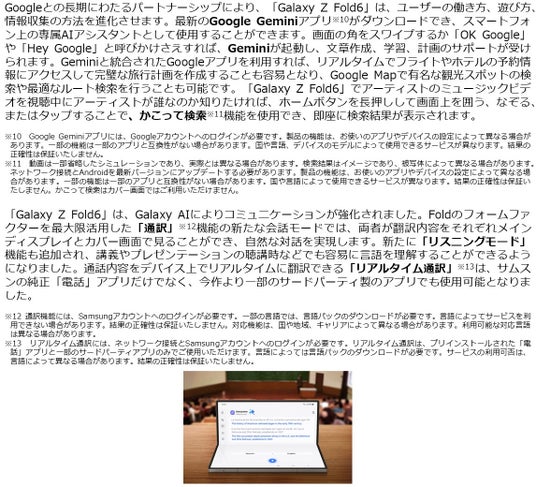 サムスン社長兼MX事業部長のTM Rohは、「サムスンは長くイノベーションに取り組んできたことにより、モバイル領域をリードしてきたと自負しています。これにより、折りたたみスマートフォンのフォームファクターを創造し、モバイルAI時代の到来を告げることができました。今回、2つの新製品を同時に発表し、世界中のユーザーに新たな機会をもたらすことができたことをとても嬉しく思います。サムスンの折りたたみAIフォンは、個々のユーザーが持つ独自のニーズを満たすことができ、さらにGalaxy AIのパワーによって強化されました。サムスンはかつてない体験を提供していきます」と述べました。