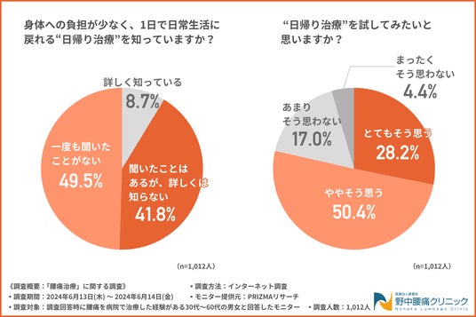「聞いたことはあるが、詳しくは知らない」と「一度も聞いたことがない」を合わせると約9割になり、身体への負担が少なく、1日で日常生活に戻れる日帰りの腰痛治療はまだ広く知られていない現状が示されました。