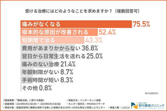 「受ける治療にはどのようなことを求めますか?(複数回答可)」と質問したところ、『痛みがなくなる(75.5%)』と回答した方が最も多く、次いで『根本的な原因が改善される(52.4%)』『短期間で治る(43.3%)』と続きました。