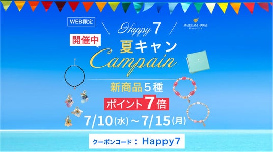 期間中、マルラニハワイ オンラインショップで対象の新商品をお買い物の際、クーポンコード【 Happy7 】をご入力いただくと、対象商品がポイント7倍!