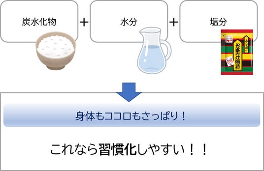 上記の通り、冷やし茶漬けは「ごはんに、お茶づけの素と冷水をかけるだけで完成」。