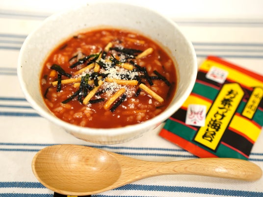 お茶漬けというよりも、もはやリゾット!お茶づけ海苔の調味顆粒によりトマトの酸味がマイルドになり、ごはんとの一体感が生まれます。あられの食感もアクセントになって楽しいです。