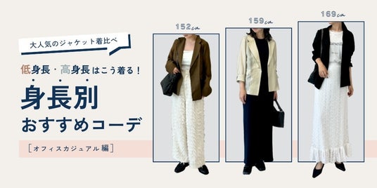 トレンドのシアージャケットを使ったオフィスカジュアルコーデを、152cm、159cm、169cm(身長163cm+6cmヒールを着用)の身長が異なるスタッフが、同じMサイズのジャケットを着るならどう着るのか?ネットでお買い物する際に気にな視点に着目した特集ページをご紹介します。