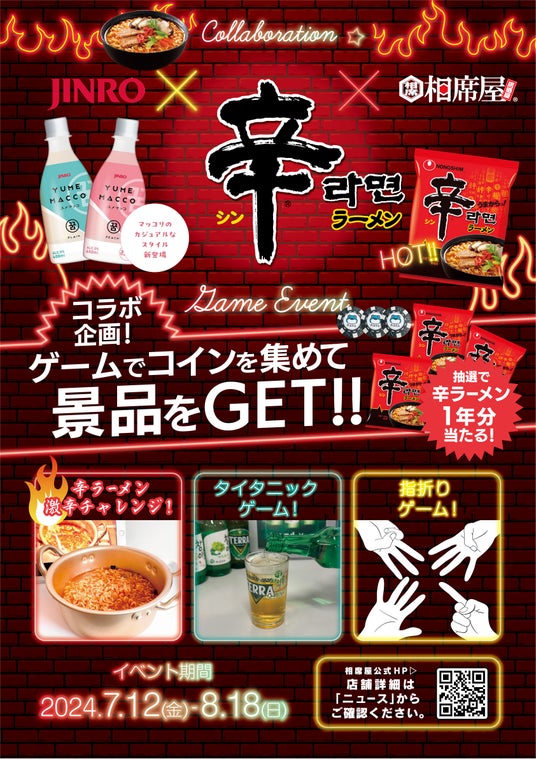また日本でも大人気の辛ラーメンとのコラボが実現、激辛チャレンジとして特別にメニューに追加、そして24年1月に新発売されたJINRO ユメマッコも飲み放題でメニューに導入されます。