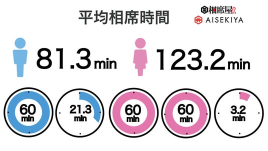 2024年6月の相席屋平均相席時間は男性は81.3分、女性は123.2分となりました。