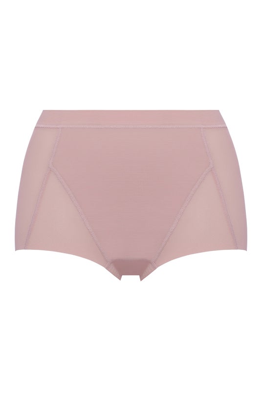 おなか部分はパワーネットを裏打ちし、ほどよくサポート。身生地には、透け感をおさえたメッシュは接触冷感素材を使用し、涼しい履きごこちに。ウエストは折り返し仕様で、夏の暑苦しさを軽減するソフトな着用感です。脚口はフラット仕様で、アウターにひびきにくく仕上げました。