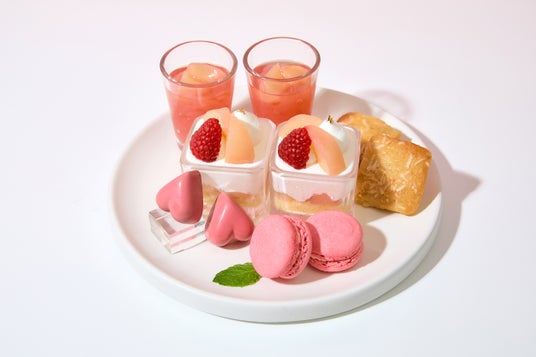 1段目と2段目には、桃の果肉をたっぷり使用したショートケーキやタルト、ジュレ、桃色のチョコレートやマカロン、アニヴェルセルで大好評のクレームブリュレやフィナンシェなど、様々な桃の味わいをお楽しみいただけます。3段目にはクロワッサンサンドや、生ハムとキウイ・モッツァレラのピンチョスなどの色鮮やかなセイボリーをご用意いたしました。